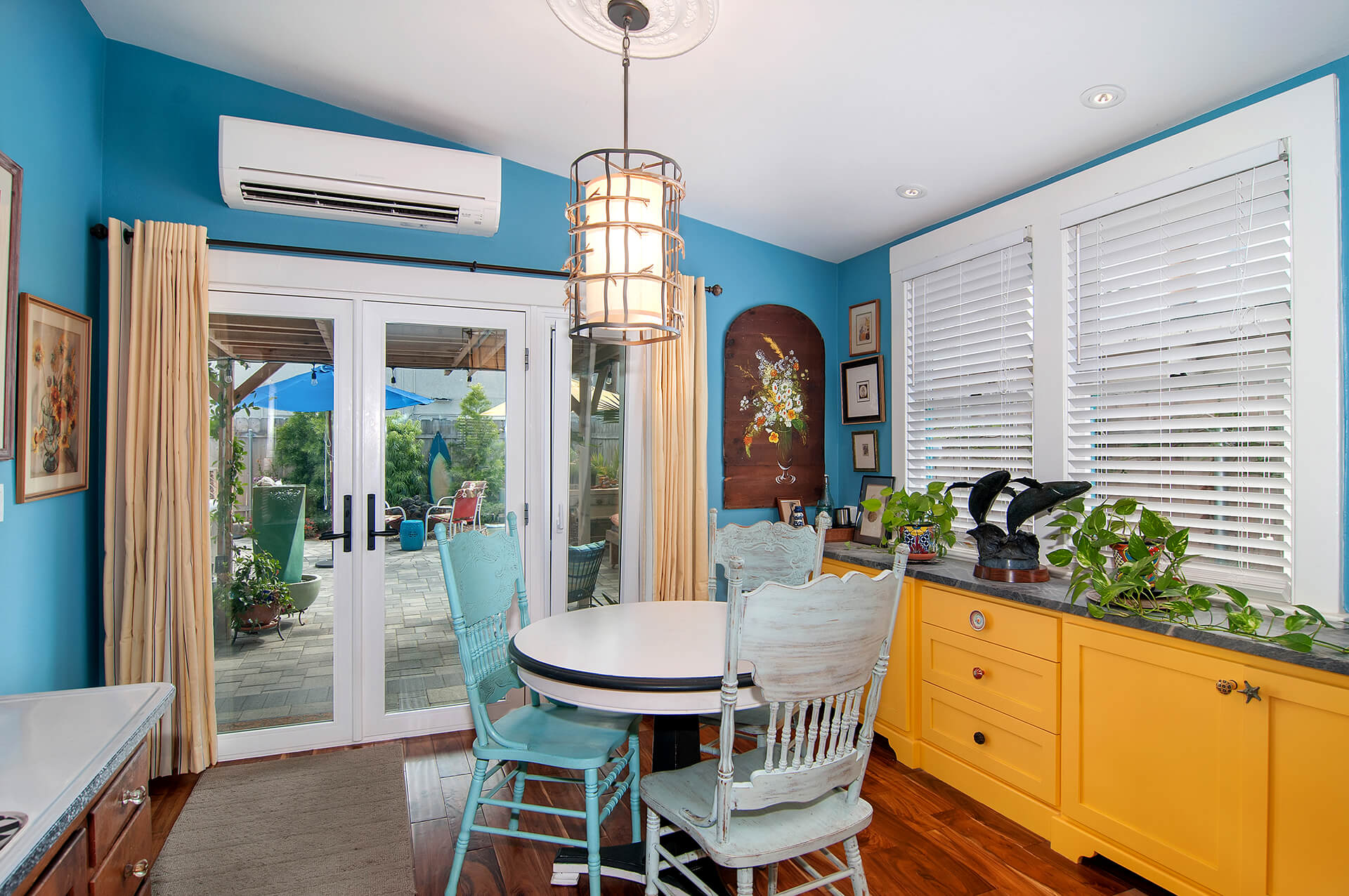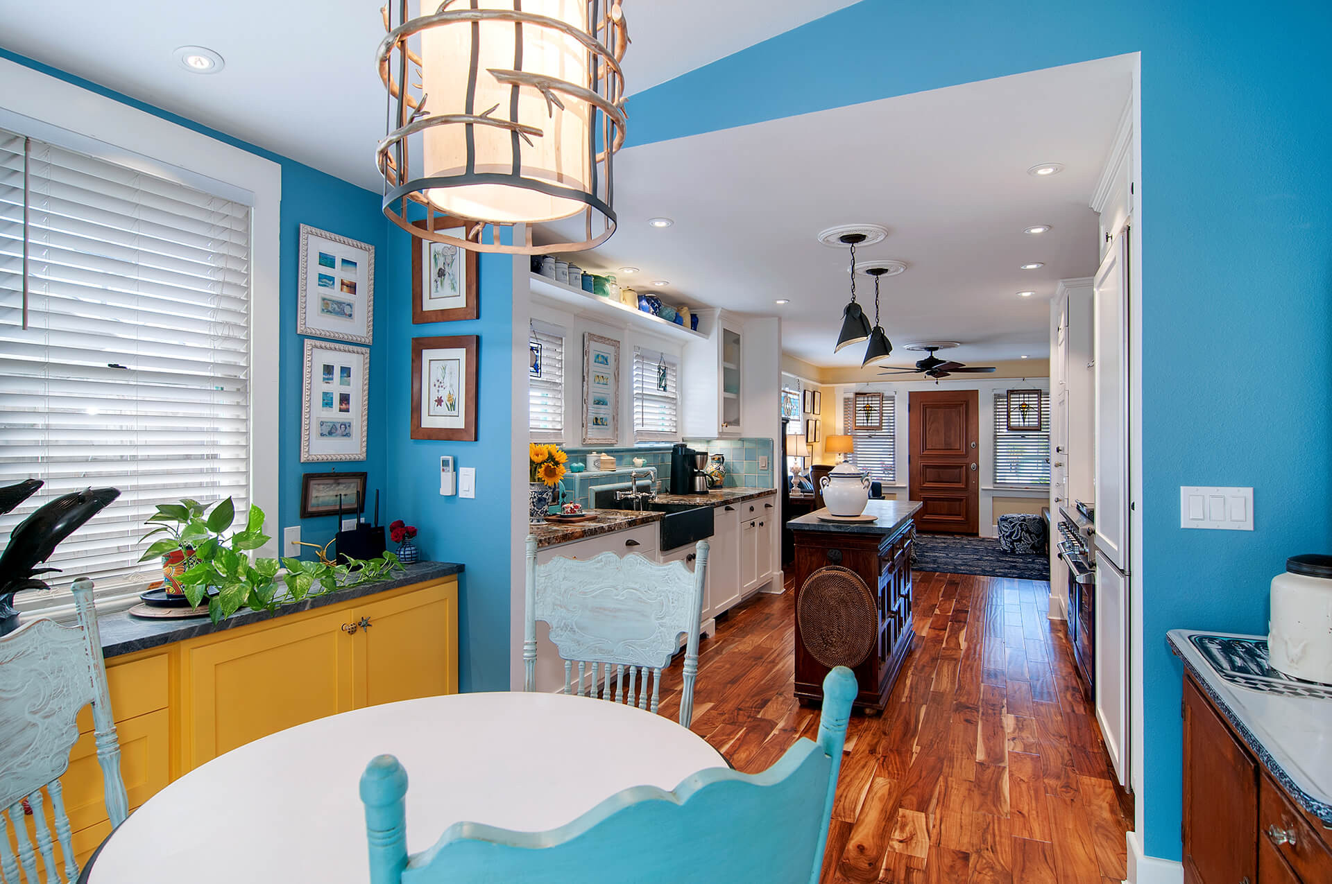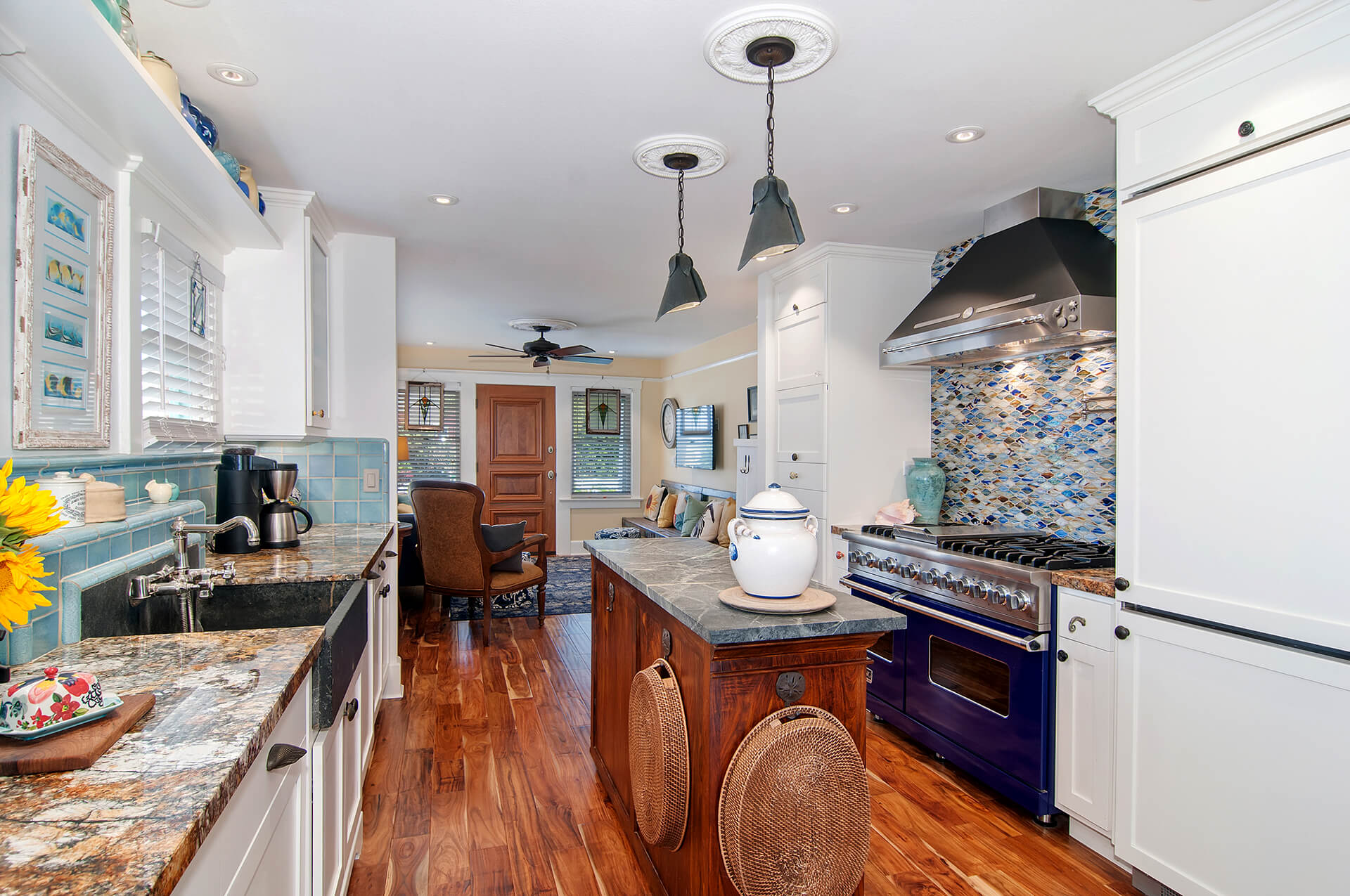Inside the small Oceanside beach cottage, the owners continued their eclectic style. The walls were painted shades of yellow, blue, and white. The furniture was a mix of vintage and modern pieces, incorporating unique pieces such as a church pew used as bench. The kitchen inspiration was taken from a 48″ Viking Range that the couple already had. The blue Viking range drove the blue colors of the kitchen back-splash’s handcrafted tile. That turquoise color led to the glass mosaic backsplash tile over the range. The owners chose soapstone as a countertop for the small island and they chose a lively granite countertop at the range. The ecletic hardware was driven by the homeowners desire to have a surprise at every turn. The bath materials also reflected the blue palette and they were inspired by the close-by crashing waves. The owners also installed new lighting fixtures, and they replaced the hopelessly damaged oak wood flooring with a new warm wood floor.