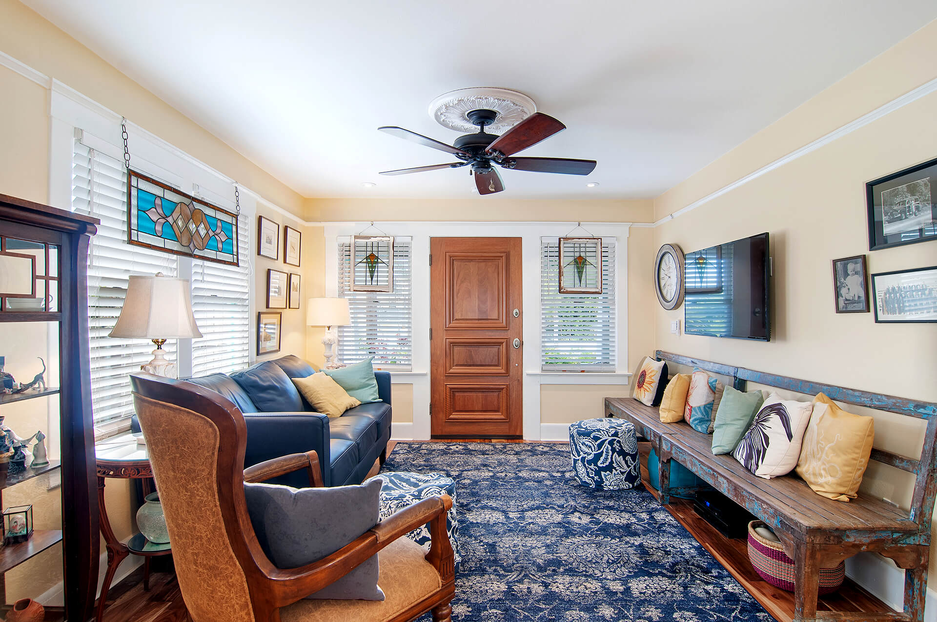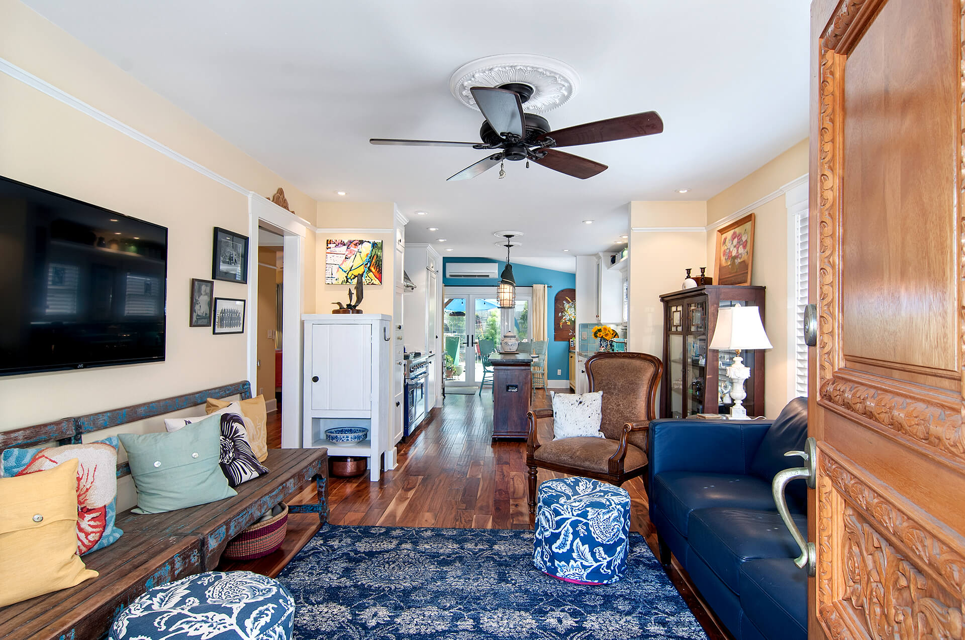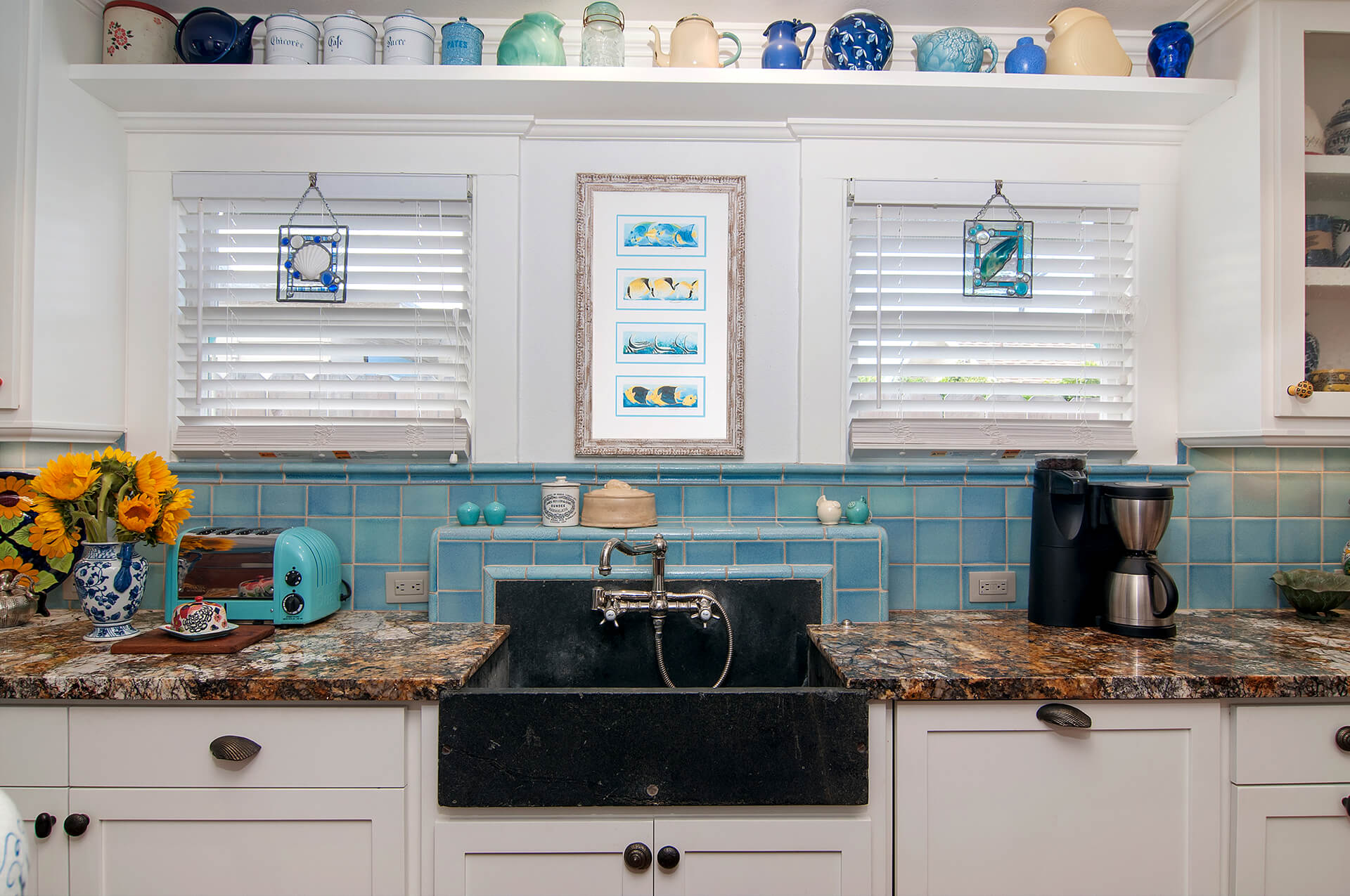 Inside the small Oceanside beach cottage, the owners continued their eclectic style. The walls were painted shades of yellow, blue, and white. The furniture was a mix of vintage and modern pieces, incorporating unique pieces such as a church pew used as bench. The kitchen inspiration was taken from a 48″ Viking Range that the couple already had. The blue Viking range drove the blue colors of the kitchen back-splash’s handcrafted tile. That turquoise color led to the glass mosaic backsplash tile over the range. The owners chose soapstone as a countertop for the small island and they chose a lively granite countertop at the range. The ecletic hardware was driven by the homeowners desire to have a surprise at every turn. The bath materials also reflected the blue palette and they were inspired by the close-by crashing waves. The owners also installed new lighting fixtures, and they replaced the hopelessly damaged oak wood flooring with a new warm wood floor.