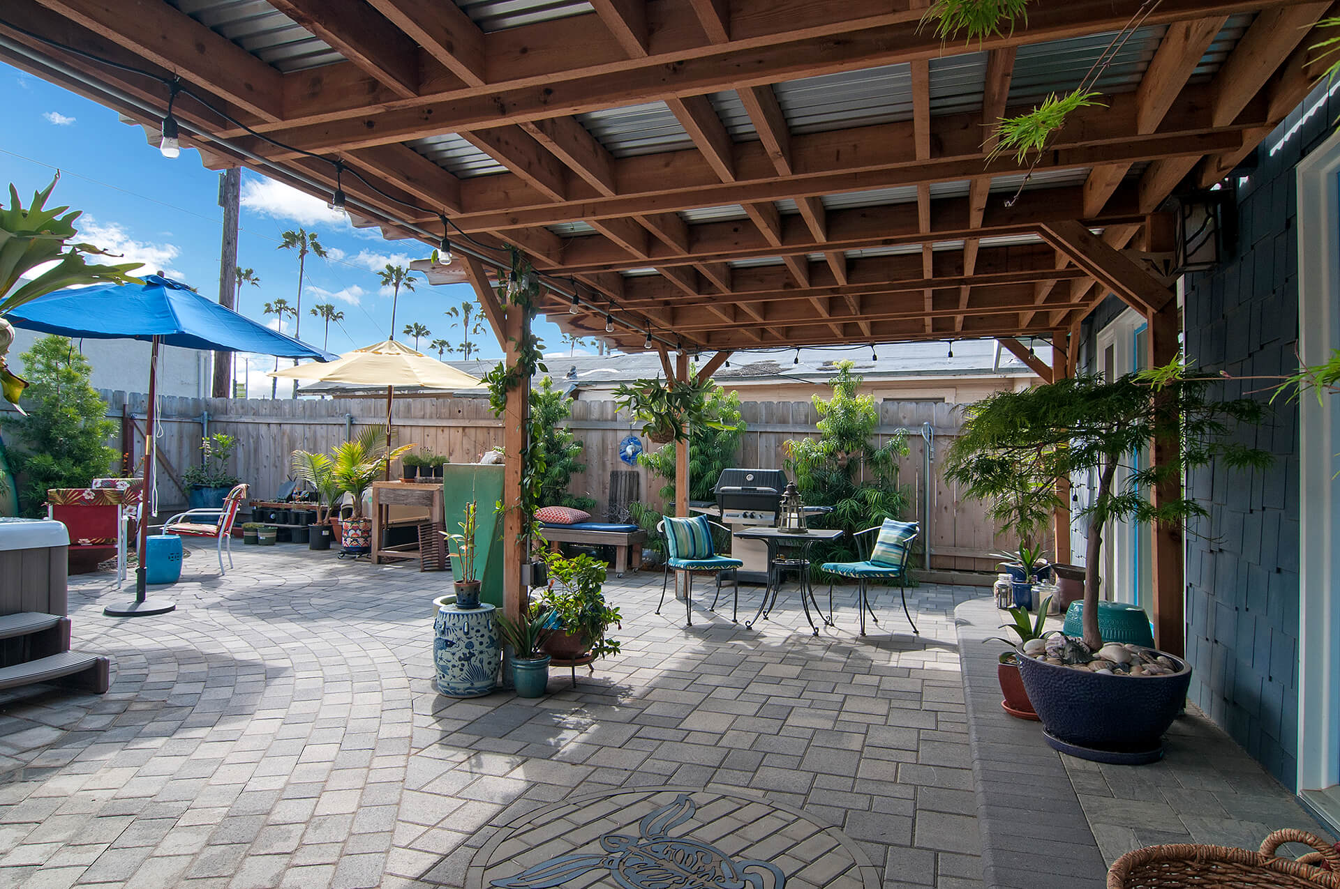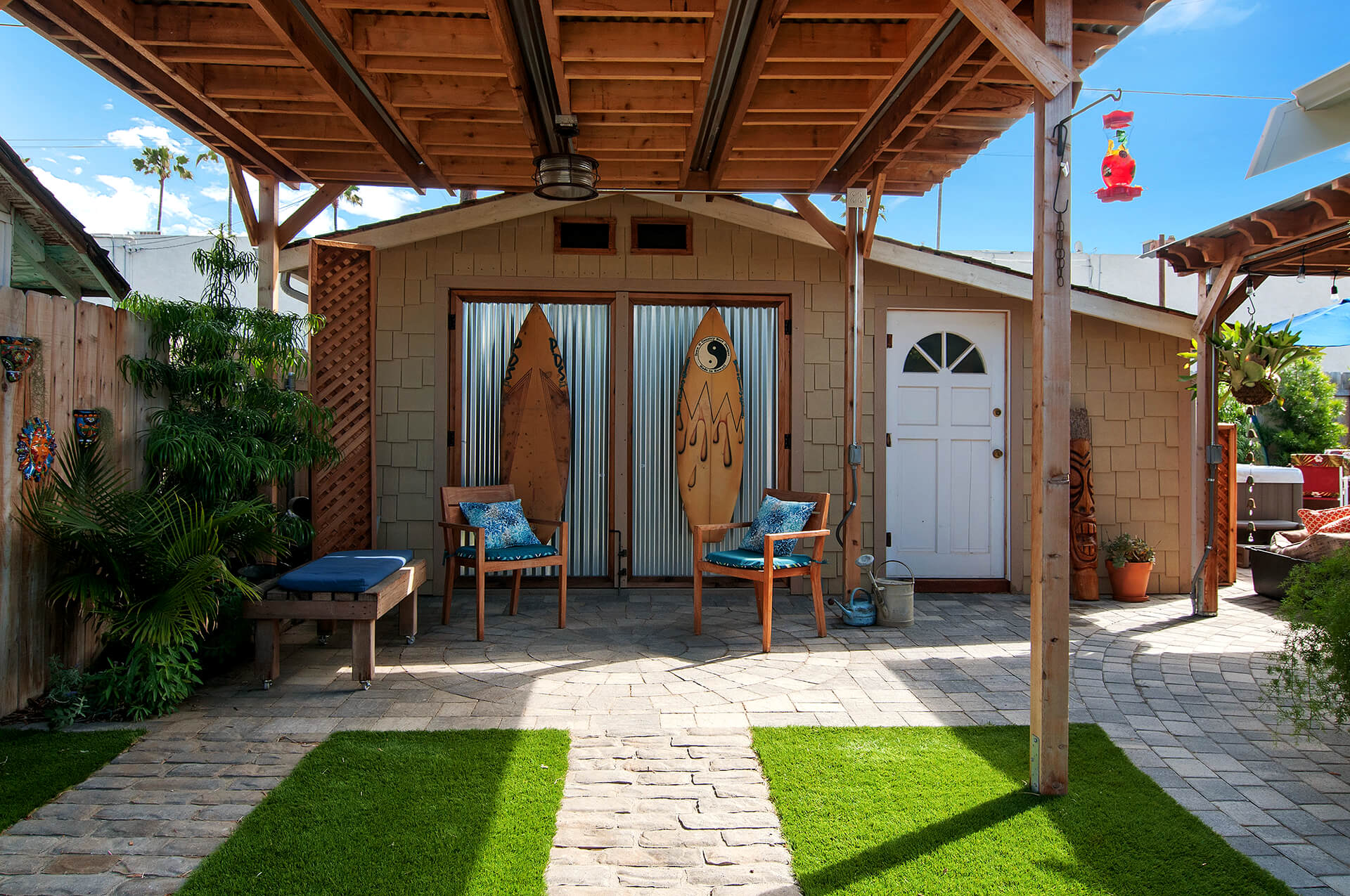 The carports and patio covers were a wonderful addition to the small beach cottage, creating an outdoor living space that was perfect for entertaining guests or just relaxing with a book. The owners added comfortable outdoor furniture, including a hammock, and strung lights around the perimeter of the patio. Two surfboards turned into extra large door handles. They added a water feature and a spa, with the carports and patio covers providing protection from the sun and rain.