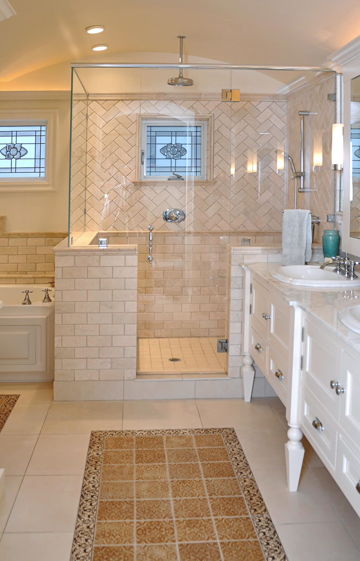 The primary suite offers patio access and a luxurious en-suite bathroom. The tile design in the primary bath is reminiscent of a Persian rug. The half height glass shower with leaded stain-glass window with rain-head shower and herringbone tile design blended to a subway stack tile layout is roomy enough for conserving water by showering together.